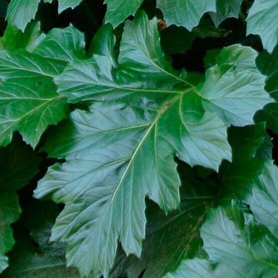 A foliage plant with large, shiny green leaves. It has tall white and mauve flowers in early summer; these should be removed as they appear because they cause the foliage to deteriorate.