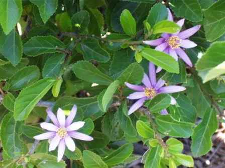 A sprawling evergreen shrub or small tree with glossy green leaves and starry, mauve-pink flowers in summer. Its fruits are square, divided into four lobes, and attract birds and insects to the garden.