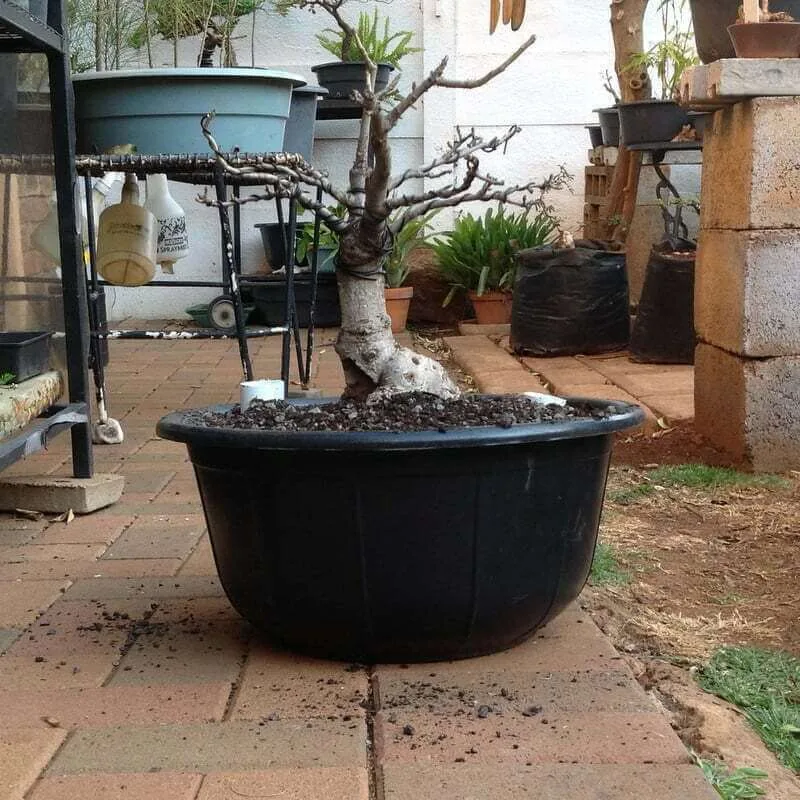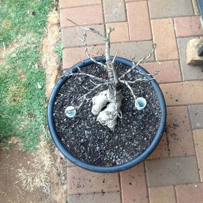 The baobab is truly a remarkable tree. If these magnificent giants could talk I'm very sure that they would have incredible stories to tell. They are amongst some of the oldest life forms on our planet. Many of them are a few thousand years old. These giants have provided food, medicines, places of refuge and worship. They have even served as tombs, prisons and ossuaries. There is even one in Devils gorge (Mpumalanga – South Africa) which is called the “Pub Tree” as it has an actual pub inside the hollowed tree. Baobabs are generally found in very hot climates with low rainfall. Using these remarkable trees as bonsai does however bring some challenges and special care in order for them to survive. These as bonsai can make some beautiful trees. They heal very well when they have been cut. Watering them is simple as they really don't need to be watered daily as to much water will rot them. They are very much like succulents in that respect. In winter they get absolutely no water. That is however also dependent on where you stay. As mentioned before they love and need the hot climate. Where I stay (Gauteng) our winters are too cold for them so what I do is once the tree has lost its last leaves in autumn I take it and put it away in the garage or a cupboard for the winter months. They should not be allowed to get frost or extreme cold weather as this could kill them. Once spring comes one should keep an eye out for any new shoots which will start to appear as the weather gets warmer. When the new shoots appear it can be put outside again and watering can start again. Make sure that the evenings are not to cold, however if it is still cold in the evenings you can always put it in a warmer spot at night like the garage or cupboard where you were keeping it before. When the weather has warmed up it can go outside permanently again. Besides the winters to watch out for, they are generally easy to work with. They can be cut, wired and styled with a fair amount of ease. Cuttings from them grow fairly easy. Unfortunately baobabs are slow growing so if you want to boost its growth put it in a much larger pot (something that's manageable if moving it is required). So that the roots have plenty of space to grow and that will help the tree fatten up quicker. What I have seen as well is growers stick PVC piping into the pots and water down those shoots. The water will run along the bottom of the pot. The tree will “smell” the water and grow faster. Watering the entire pot surface occasionally is however a good idea as the roots may not be reaching the water which goes through the PVC spouts. In times when we have our rainy season it's a good idea to take it out of the rain if it's been raining consecutive days in a row. This will allow the tree some time to dry out so that it will not start rotting from over watering. Look after your tree and it can be passed from generation to generation and receive the same amount of TLC which you gave it.