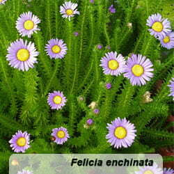 ![]() | Felicia enchinataAvailable in white and pink this indigenous fine leafed Felicia is found along road sides the South African coastal belt and on sand dunes. The oval leaves are shiny, evergreen and stiff whilst the yellow centred flowers are formed in abundance from Autumn to spring on the top of upright multibranching stems. Light brown fluffy seed heads follow the flowers. A brilliant specimen for rock gardens. |