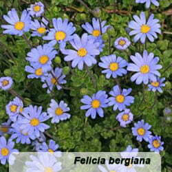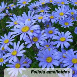 Felicia amelloidesThis striking little shrublet is an excellent specimen for many a design use. from coastal and rock gardens to containers edging and boarders. Ameloides’s sky blue daisy like flowers with contrasting bright yellow centres, stand proudly over its finely haired rich light green foliage. | ![]() |