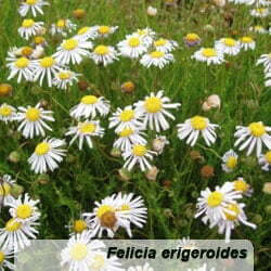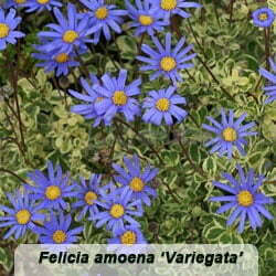 Felicia erigeroidesThis shrubby perennial is indigenous to South Africa and quite similar to F.amelloides with the exception of its multi coloured foliage. The foliage is aromatic, ovally shaped and variegated green with splashes of cream. The same prominent daisy like sky blue yellow cantered flowers are formed through most of the year. It requires moderate watering and full sun, but does well in containers, boarders, in mass and so on. | ![]() |