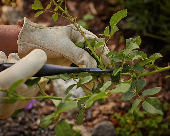- Young rose bushes of the hybrid tea variety are pruned back to one-third of their growth to allow sturdy shoots to develop.