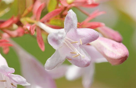 Leaves are usually oval in shape with a deep, glossy green color. Some varieties are deciduous, common to cooler climates. Other varieties, originating from warmer climates, are evergreen. This plant bears funnelform or tubular flowers, white or pinkish, sometimes with orange blotches, through summer. In the garden they can be planted singly in a shrub border or as a low informal hedge. Abelia varieties prefer well-drained, fertile soil in full sun but sheltered from strong winds. Prune in winter, removing some of the basal shoots to make room for new growth, plus the cane ends.