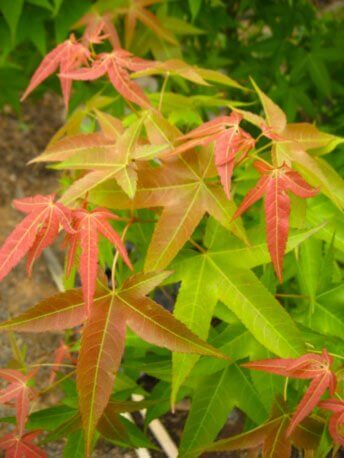 | Foliage | Its five deeply lobed glossy leathery leaves emerge reddish in spring becoming dark green during summer then flushed from a golden-yellow, amber-orange to a striking crimson colouration in autumn. |