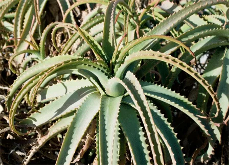 Krantz aloe has blue green, curved and tapering, toothed leaves/foliage. The rosettes of fleshy leaves are edged with recurving prickles.