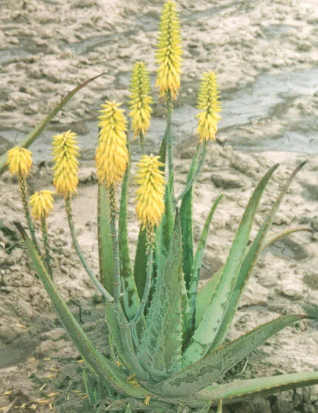 This plant is valued for its sap’s medicinal properties. It has green to grey green, thick and fleshy foliage. Yellow corolla flowers on a spike in Summer.