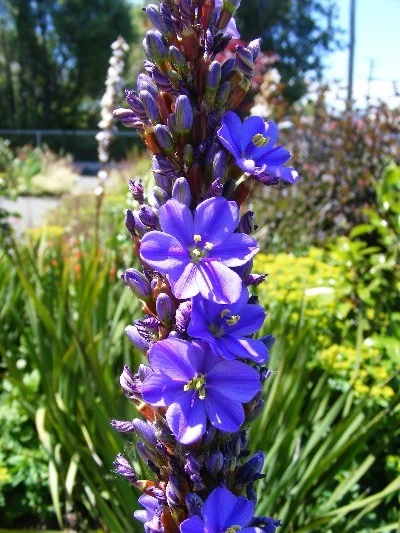 Blue star-like florets cluster around the sides of the 300mm-tall spiky stems.
