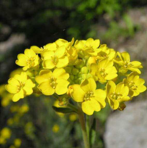 A shrubby perennial with silver-grey foliage and scented, golden-yellow flowers in spring and early summer. An excellent foreground plant. Cut back heavily in autumn to ensure compact spring growth. Needs well-fed soil and a cool climate. Also known as Alyssum saxatilis.