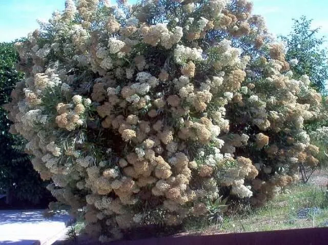 | Flowers | January February October November December A mass of tiny sweetly scented flowers form in creamy white dense coloured clumps during summer. |
