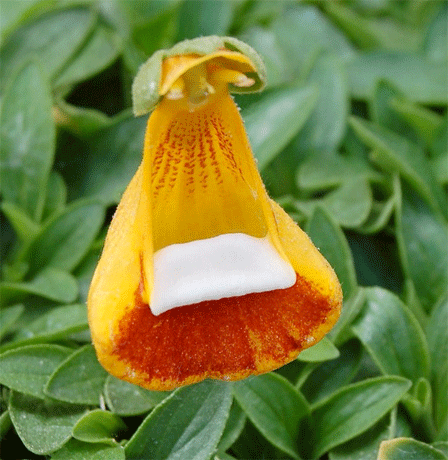 Flowers are 2-lipped with a small hooded upper lip ans a large lower lip that is inflated and pouch like. Yellow, orange, and red shades dominate the flower colors.