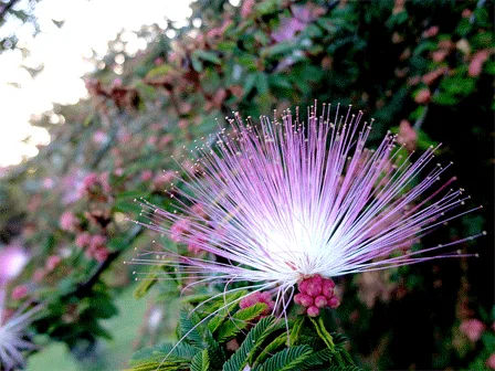 Summer-flowering shrub with silky, pinky-white, powderpuff-like flowers.