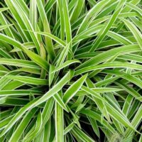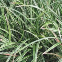 Carex morrowii ‘Variegata’ has narrow, grass-like leaves, vertically striped with white and green.