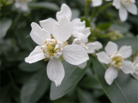 The fragrant white, star-shaped flowers show up well against the attractive, dark, evergreen foliage. The clusters of flowers appear in spring, sometimes in late summer. A lovely, rounded, compact, medium-sized shrub for planting in courtyards, patios, large pots and mixed borders. It belongs to the citrus family, so the leaves are aromatic, and consist of three glossy deep green leaflets. This shrub prefers a cool climate, and does not do well in warm or subtropical areas.