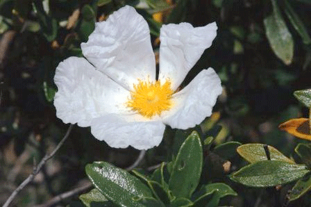 A strikingly handsome shrub with sticky leaves and pure white flowers.
