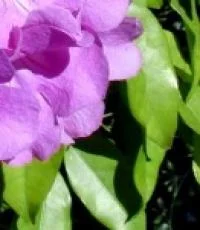 A strong grower with masses of tubular-shaped mauve blooms with spreading lobes. Shiny green leaves. Previously known as Bignonia purpurea.