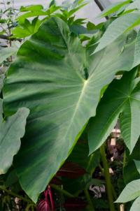 A tuberous perennial whose large (20 150cm long), heart-shaped leaves create a tropical effect. It is evergreen in frost free areas and deciduous in areas with light frost. The large rhizones grow on or just below the ground. In the tropics, plants of this genus, notably C. esculenta, are cultivated for their edible corms, the source of a traditional starch known as taro, eddoe or dasheen.
