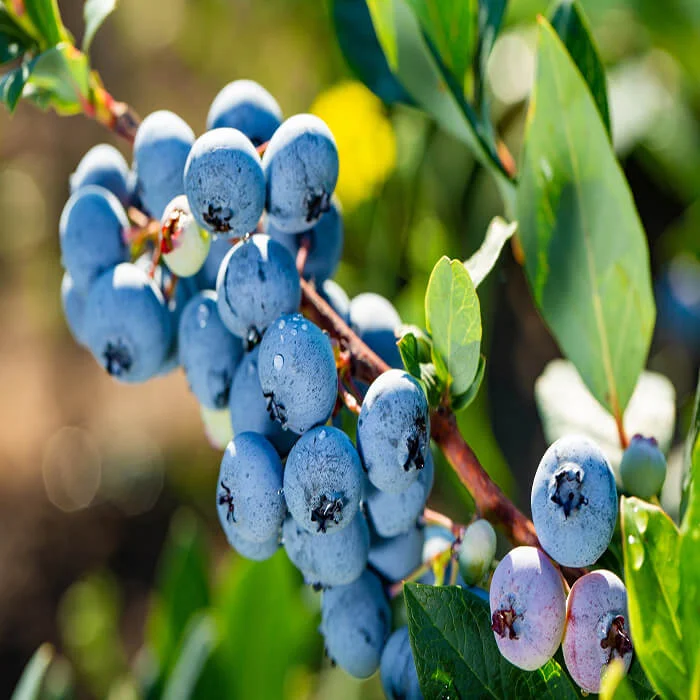Blueberries are crown forming, woody, perennial flowering shrubs grown for its blue or purple berries. They have oval elliptical leaves which grow alternately along the stems. Blueberries produce clusters of small urn or, bell-shaped flowers ranging from white to pale pink in colour.