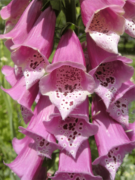 Foxgloves are biennials, but can also be treated as short-lived perennials. They are hardy, erect plants with light green, woolly, leaves and long spikes of pendulous, spotted flowers. The colour of the flowers varies from purple and pink to white.