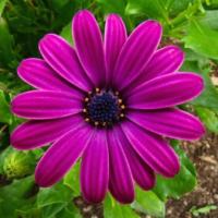 Bears large, purple, daisy-like flowers with deep-blue centres, borne from early spring to late summer.