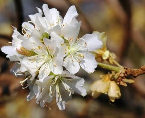 A gracefully shaped, small, deciduous tree with a dark trunk and clusters of creamy-white flowers that appear it in late winter. It is fast growing under cultivation.