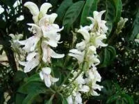 A medium- to large-sized bushy shrub with large, dark green leaves. It bears showy, fragrant, white flowers in dense, compact sprays during summer. Flowers have purple markings in the throat. The seeds burst open with an explosive crack, hence the common name ‘pistol bush’. It prefers damp conditions. Good in a background shrub border, in semi-shaded positions.