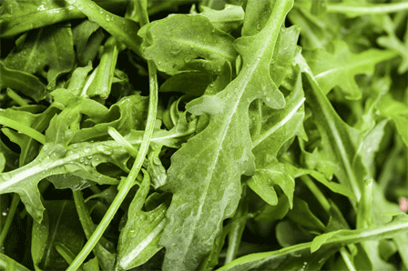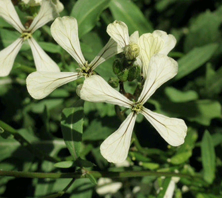 Eruca sativa has deeply divided foliage. The leaves have a strong, distinctive, nutty, peppery, mustard flavour.
