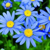 A popular bushy shrub with many varieties. Felicia amelloides has sky-blue flowers with bright yellow centres. It flowers all year round, but mainly in spring, and tolerates semi-shade. Also available in a white form. Low-growing F. amoena ‘Variegata’ has green-and-yellow variegated leaves and small blue flowers all year. F. bergiana (dwarf felicia) is a compact, low-growing, dark green shrub, with small blue, daisy-like flowers all year. F. enchinatais a small, fine-leafed shrub with blue flowers all year. F. erigeroides (wild Michaelmas daisy) is small, with pink flowers all year.