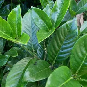 This plant bears leathery, dark green elliptical leaves.