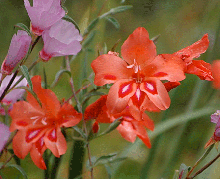 Gladiolus is native to Southern Africa. Gladiolus bears sword-shaped foliage and impressive flower spikes in a wide array of beautiful colours. Plant corms at 4 times their own depth, in full sun and light well-drained soil. They make good cut flowers.