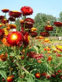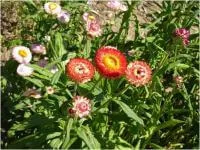 | Flowers | Description:Flowers look like double daisies, with straw-like petals in bright scarlet, purple, orange, pink, yellow and white. |