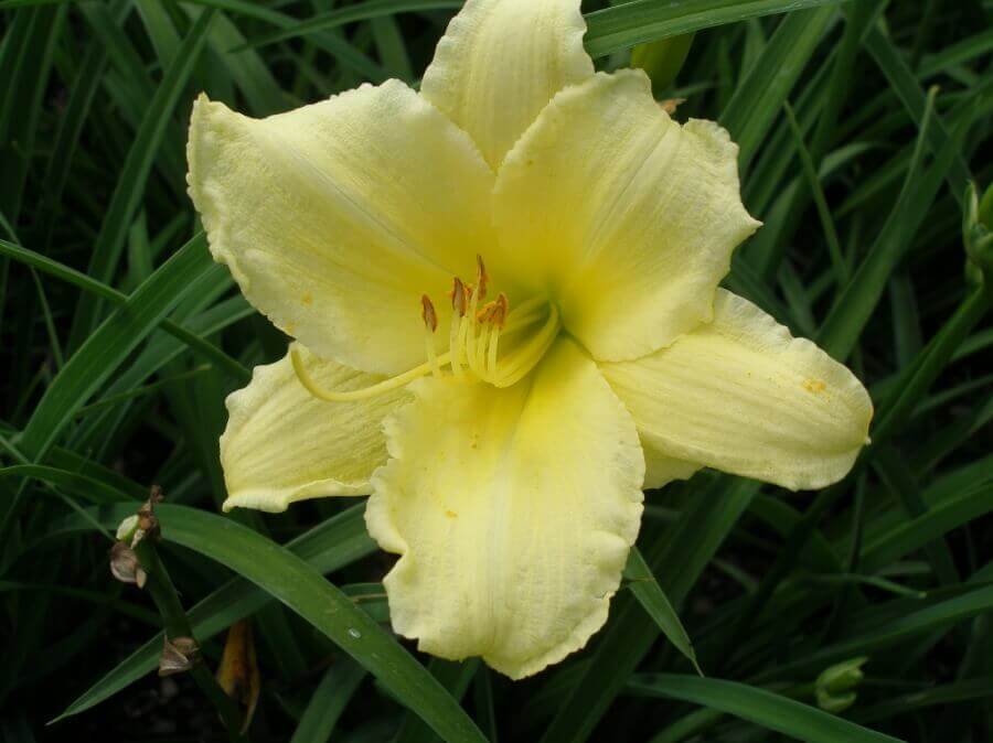 Stella Supreme Daylily features bold lightly-scented buttery yellow trumpet-shaped flowers with yellow throats at the ends of the stems in early summer. The flowers are excellent for cutting. It’s grassy leaves remain green in color throughout the season.