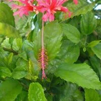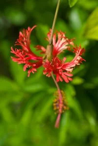 A vigorous, floriferous, pendulous-flowered red hibiscus bearing its flowers on erect stems.