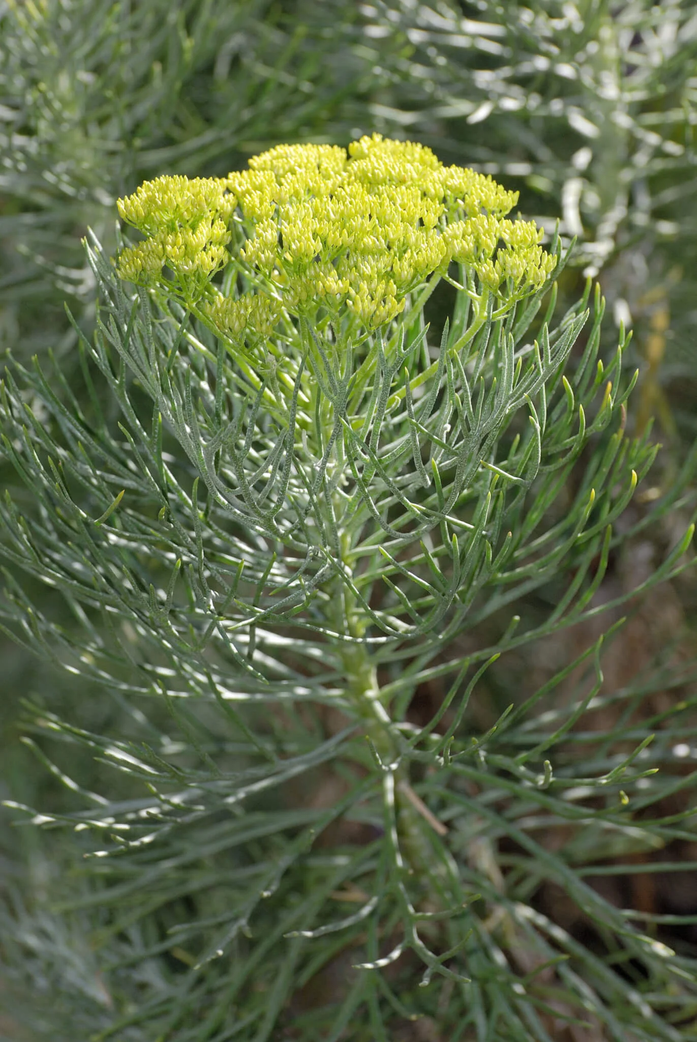 Hymenolepis crithmoides has umbels of yellow, honey-scented, pollinator attracting flowers all Summer. It bears needle-like, grey, leatherly foliage. Plant in full sun, average to rich, well-drained soil. Prune to shape after flowering. This plant will brighten up any garden. Use in mediterranean gardens and mixed plantings.