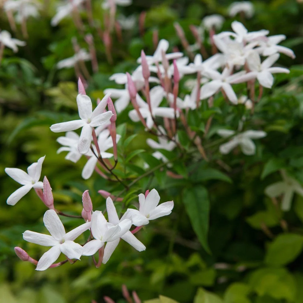 This slow-growing jasmine bears sweetly scented, star-shaped pure white flowers during summer. J. grandiflorum is similar in appearance, but has larger flowers.
