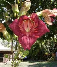 | Flowers | This strange, semi-deciduous tree bears beautiful, bell-like, purple-red flowers. |