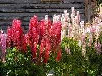 Tall flower spikes with pea-like flowers in shades of purple, blue, red, rose, orange, yellow and white, and mid-green.