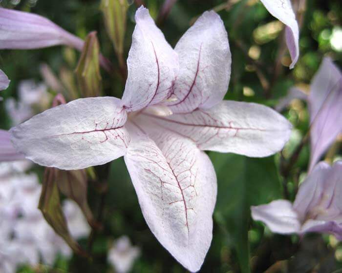 Flowers, borne in late spring, are white, tinged pale pink with purple lines. Plants with lavender-coloured flowers are also available.