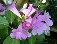 A free-flowering evergreen creeper that can be trained into a shrub. It produces panicles of large,trumpet-shaped, lilac-mauve flowers that provide colour throughout autumn and winter. The buds of this vine start appearing in January and it goes on flowering into August. Also known as Bignonia alliacea and Pseudocalymma alliaceum.