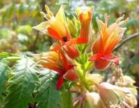 A fast-growing shrub with strongly aromatic leaves. The bell shaped flowers are bright red with black markings at the throat and are borne in clusters in spring. Does well in coastal gardens. Attracts sunbirds.