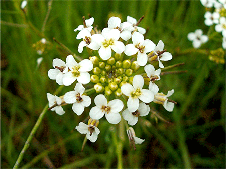 This species is native to Europe. It bears bright green foliage with slightly fleshy margins and clusters of white flowers from mid Spring to mid Autumn followed by brown fruits. The leaves are often used in salads.