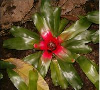 Blushing bromeliad has spine-toothed, strap-shaped, bright green foliage with tubular, blue-purple flowers among red bracts in summer. Prefers semi-shade.