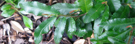 This plant has narrow, elliptic, shiny foliage with serrated margins.