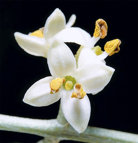 An attractive, long-living evergreen tree with dull grey-green foliage. Olive trees are often planted where an Italianate or Mediterranean ‘look’ is desired. Grouped together, they make good windbreaks, are useful for screening and help to bind the soil. Black and green olives come from the same tree; green olives are just that, while black olives are ripe. Olives need to be treated (pickled) before they can be eaten.