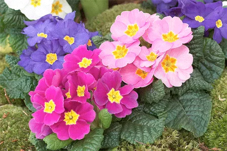 Most primulas form basal rosettes of heavily veined leaves from which emerge the flower stems, sometimes with just a single bloom. The flowers usually blooms in Spring. Plant in moist, humus-rich, well-drained soil. These species prefer dappled shade.