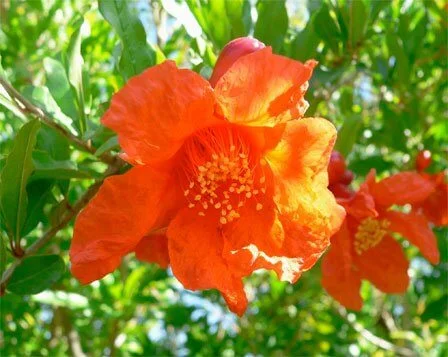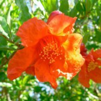 A fruit-bearing deciduous shrub producing lovely orange-red flowers in midsummer, this shrub brings colour to a border when not much else is on view. Prune to keep compact. P. granatum ‘Stricta’ has double white flowers with pink stripes in summer. ‘Nana’, a miniature flowering pomegranate, produces orange-red flowers throughout the summer. This delightful small shrub, which grows to 500mm tall, makes an ideal container subject and is also suitable for rockeries and foreground planting in borders.