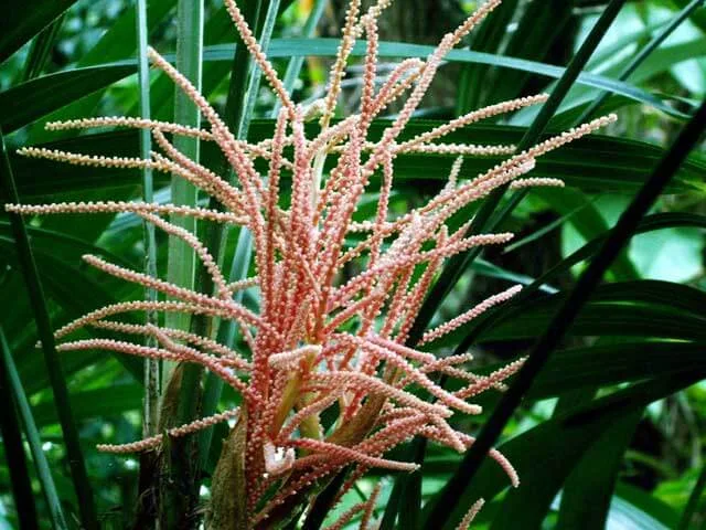 This palm bears bowl-shaped cream flowers, in Summer.