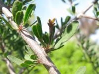 This evergreen shrub has twiggy, spiny, small, blue-green leaves.