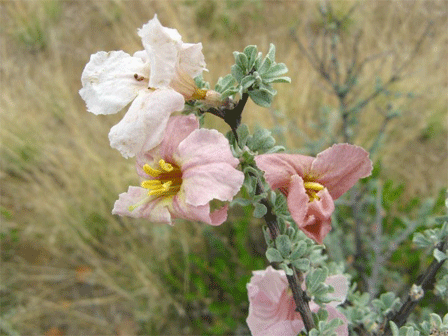 This deciduous shrub or small tree has gray-green hairy foliage. It bears light pink flowers.