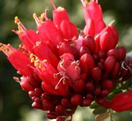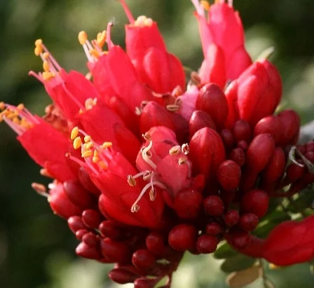 A small, shrubby, evergreen tree ideal for arid regions. In spring, it bears large, dense, clusters of showy red flowers that attract birds. It is very decorative, but rather slow growing.